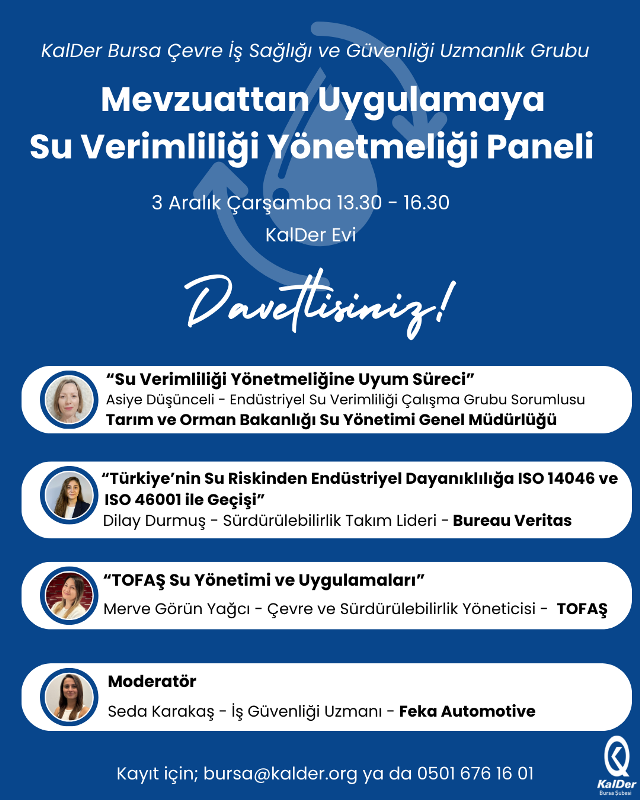 3 Aralık Çarşamba günü 13:30 - 16:30 saatleri arasında KalDer Bursa Çevre İş Sağlığı ve Güvenliği Uzmanlık Grubunun düzenlediği ‘Mevzuattan Uygulamaya Su Verimliliği Yönetmeliği’ konulu panelimizi KalDer Evi’nde gerçekleştireceğiz.