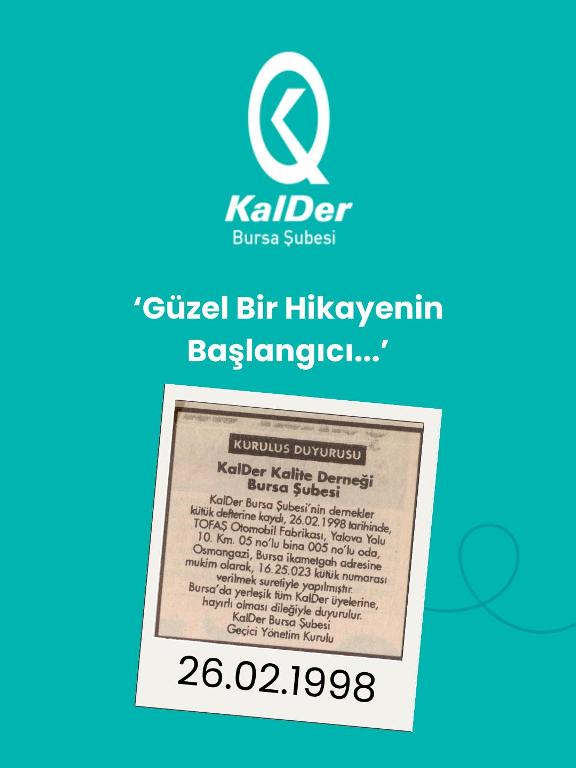 Sizlerle paylaştığımız üzere KalDer Bursa olarak 28. yılımızı ulaşmanın gururunu yaşıyoruz. 26 Şubat 1998’de 11 kurucu üye ile başlayan yolculuğumuz devam ediyor; kalite anlayışını yaymak, kurumlara ve bireylere değer katmak için var gücümüzle çalışıyoruz. Tüm bu zamanlarda bizlere destek veren tüm üyelerimize, geçmiş dönem başkanlarımıza, yönetim kurulu üyelerimize, çalışanlarımıza, gece gündüz demeden emek veren gönüllülerimize ve paydaşlarımıza gönülden teşekkür ediyoruz. Nice yıllara, KalDer Bursa Şubesi!