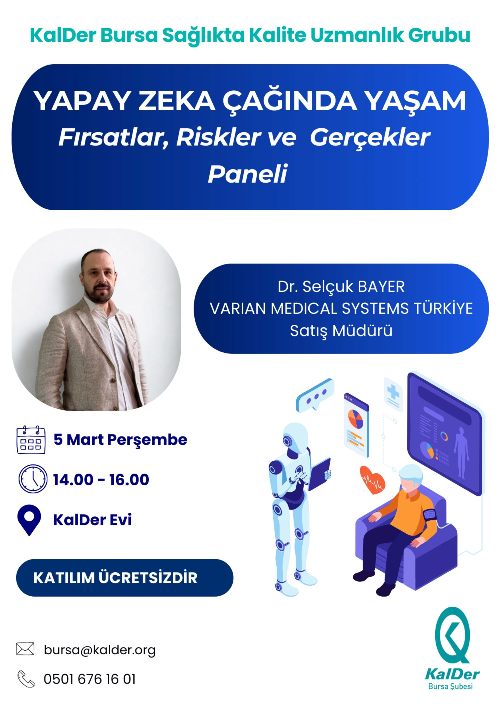 KalDer Bursa Sağlıkta Kalite Uzmanlık Grubunun düzenlediği ‘Yapay Zeka Çağında Yaşam: Fırsatlar, Riskler ve Gerçekler’ konulu panelimize davetlisiniz. Etkinliğe katılım ücretsiz olup linkten kayıt olabilirsiniz.